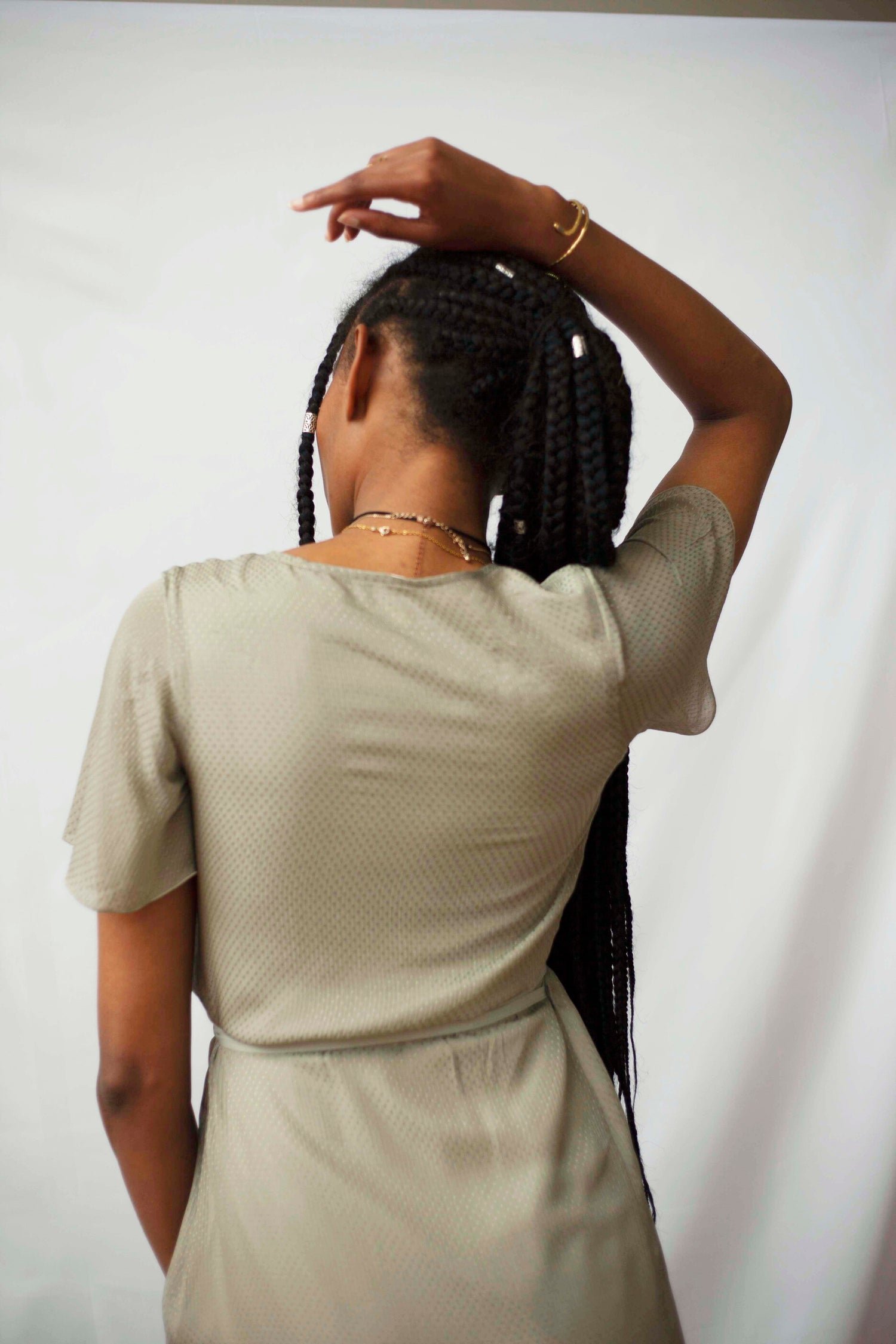 Pour cette robe, nous avons travaillé avec un tissu d'une grande qualité. Il nous vient d'une maison de couture du groupe LVMH, récupéré auprès de Nona Source, leur propre service de stocks dormants de tissus.